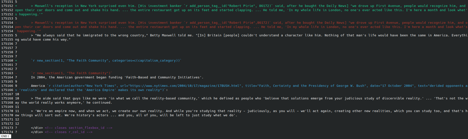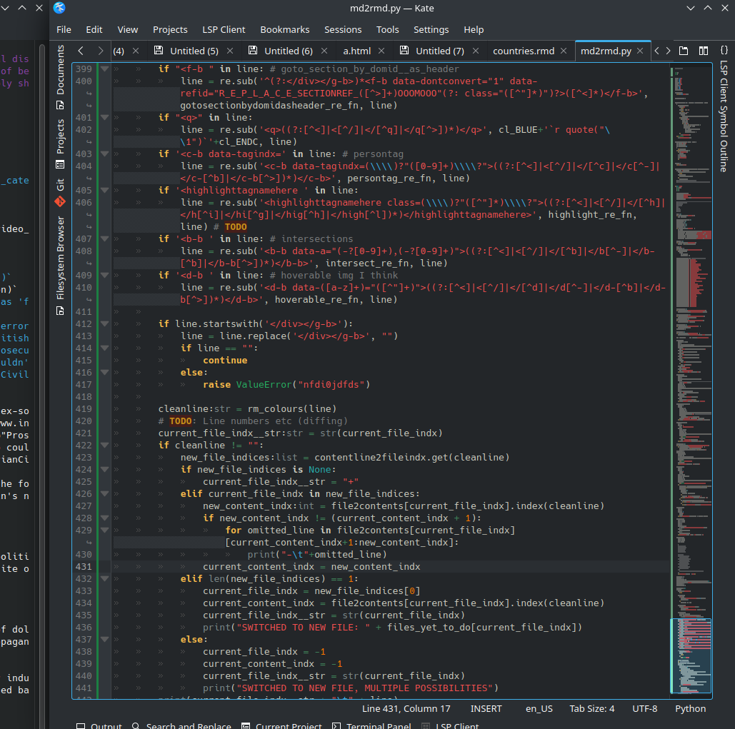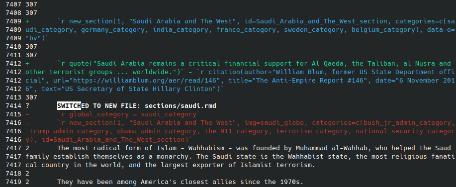 My source code, of course, is split over dozens of different files, in over a dozen folders, like a tree. Getting the script to recognise changes-of-file - especially when the changes often involved moving paragraphs from one file to another - was a huge pain.